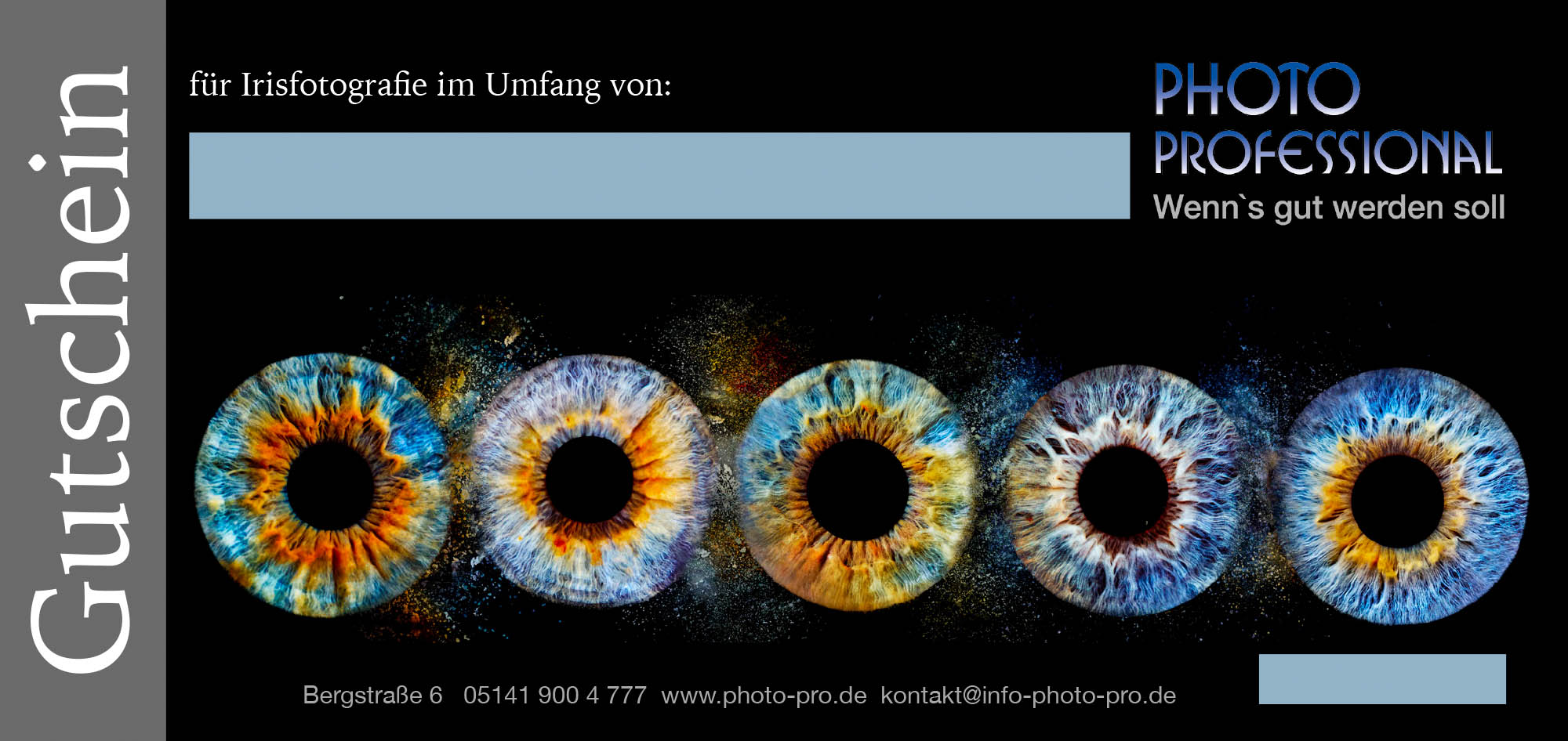Du suchst nach einem außergewöhnlichen Andenken und einem besonderen Geschenk? Unsere Gutscheine für Iris-Fotografie machen es möglich! Ob allein, als Paar oder in einer Collage mit Familie und Freunden - die Gutscheine gibt es direkt im Studio oder per E-Mail. Du kannst wählen, ob ein fester Betrag vermerkt wird oder nicht.
